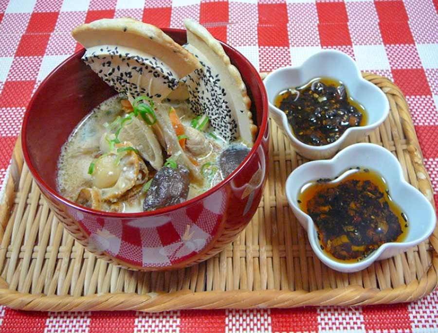 - 03器に盛り、せんべいを適宜割って入れ、黒にんにくゴマラー油を適宜入れていただく。